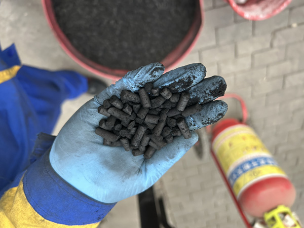 在進(jìn)行擠壓成型前,膨潤土和木質(zhì)生物炭粉混合的同時要添加一定比例的水,只有在濕潤的狀態(tài)下,膨潤土的粘結(jié)性才能夠充分體現(xiàn)出來。否則擠壓出來的成品容易破碎。